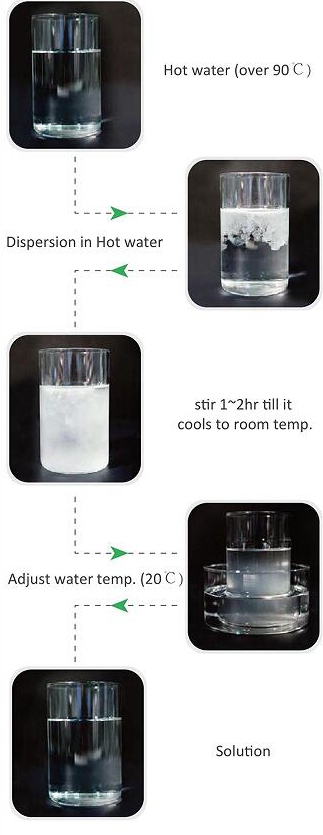 If non-surface treated powder is put into cold water directly, it easily forms lumps due to its too quick solubility with cold water. To prevent lumping, put the powder into the hot water(over 90°C)first, then stir in order to disperse the powder, and then cool down the solution while stirring continuously.